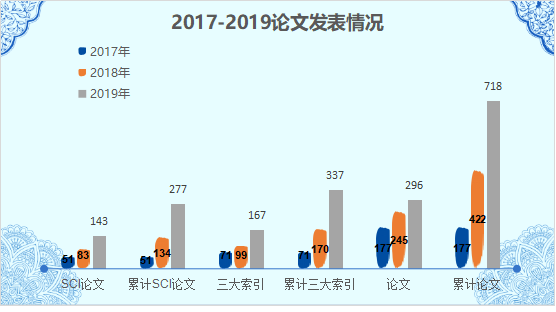2017年,学院共发表论文177篇,其中三大索引论文71篇,SCI论文51篇;2018年,学院共发表论文245篇,其中三大索引论文99篇,SCI论文83篇;2019年,学院共发表论文296篇,其中三大索引论文167篇,SCI论文143篇。