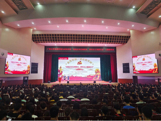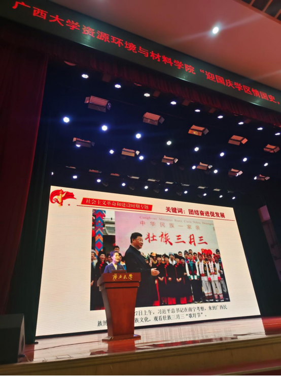 9月26日晚,我院在大礼堂开展“金色年华·党在资环材——迎国庆学区情国史,跟党走立报国壮志”主题报告会,报告会邀请了广西革命纪念馆的讲解员围绕广西新民主主义革命时期历史、社会主义革命和建设时期历史两个专题宣讲。学院党委书记沈大强、副书记吴达慧与师生党员代表及2021级全体新生共同参加了报告会。