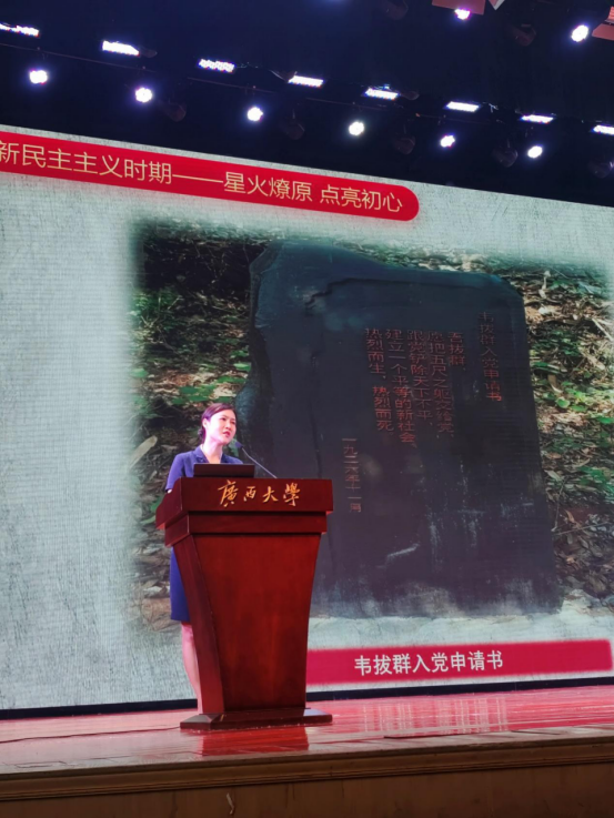 大会伊始,吴达慧副书记主持报告会,她讲到,今年中国共产党迎来百年华诞,今年又是实施“十四五”规划、开启全面建设社会主义现代化国家新征程的第一年,作为一名广西大学学子,立足广西深化对中国共产党党史的了解,依托区情增进对广西革命发展史的理解,非常必要、非常迫切。