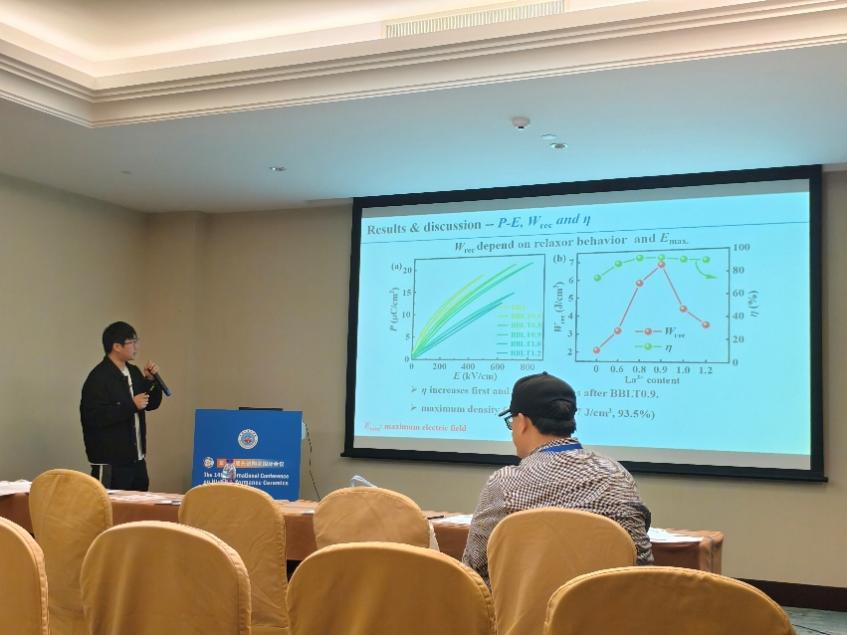 12月1-3日,在“Advanced Dielectrics for Energy Storage Applications”分论坛会议上,罗能能教授以“NaNbO3 antiferroelectrics with reversible AFE-to-FE phase transition”为题针对反铁电陶瓷储能性能改善介绍了调控“晶格旋转畸变”策略,并担任该分会场主席;黄瑞助理教授、博士研究生何霞凤、硕士研究生徐凡非以口头报告,硕士研究生熊倩、赵琨、杨超以海报形式分享了我校在功能陶瓷领域最新的学术研究成果。硕士研究生熊倩、赵琨还作为志愿者参与了会议的组织。会场互动踊跃,提问不断,呈现出活跃的学术对话与思想碰撞。该分会获得大会“Outsanding Organizing Symposium”奖。