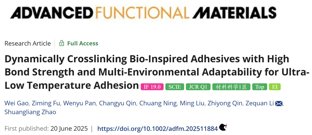 近日,我院“结构热力学与微纳化工”课题组在特种木材粘合剂的研制与应用方面取得突破,研究成果以“Dynamically Crosslinking Bio-Inspired Adhesives with High Bond Strength and Multi-Environmental Adaptability for Ultra-Low Temperature Adhesion”为题发表在国际顶级学术期刊Advanced Functional Materials上,广西大学是唯一通讯单位。