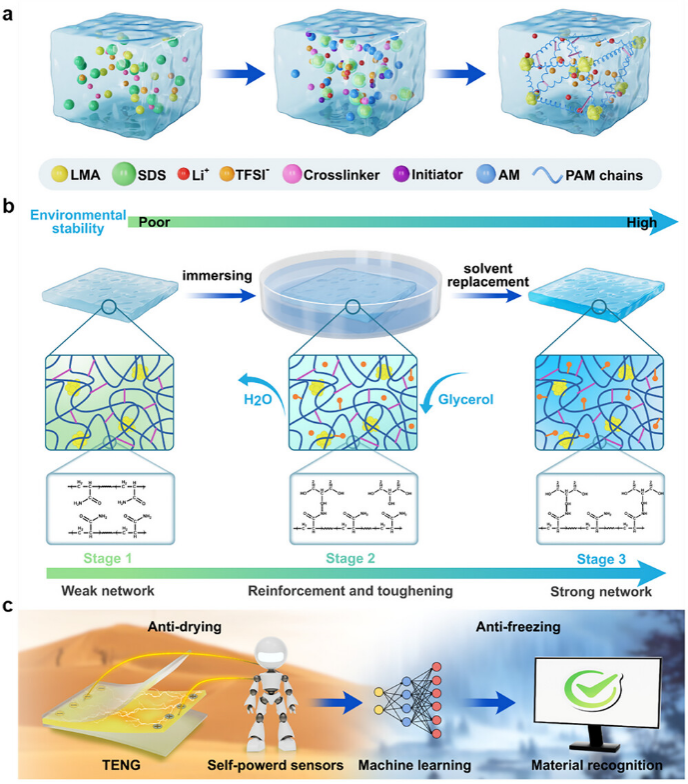更引人注目的是,研究团队将这一创新材料与机器学习技术相结合,开发出一套高精度自供电传感系统。实验数据显示,该系统对材料的识别准确率高达99.3%,为智能传感领域提供了新的技术解决方案。该研究不仅为导电水凝胶的制备提供了新思路,更为自供电传感器件的开发开辟了新途径。