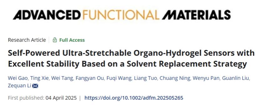 近日,我院“高分子及结构板材”课题组在功能材料领域取得重要研究进展。相关成果以“Self-Powered Ultra-Stretchable Organo-Hydrogel Sensors with Excellent Stability Based on a Solvent Replacement Strategy”为题,发表在国际顶级学术期刊《Advanced Functional Materials》上。值得关注的是,这是该课题组本年度在该期刊上发表的第二篇高水平研究论文。