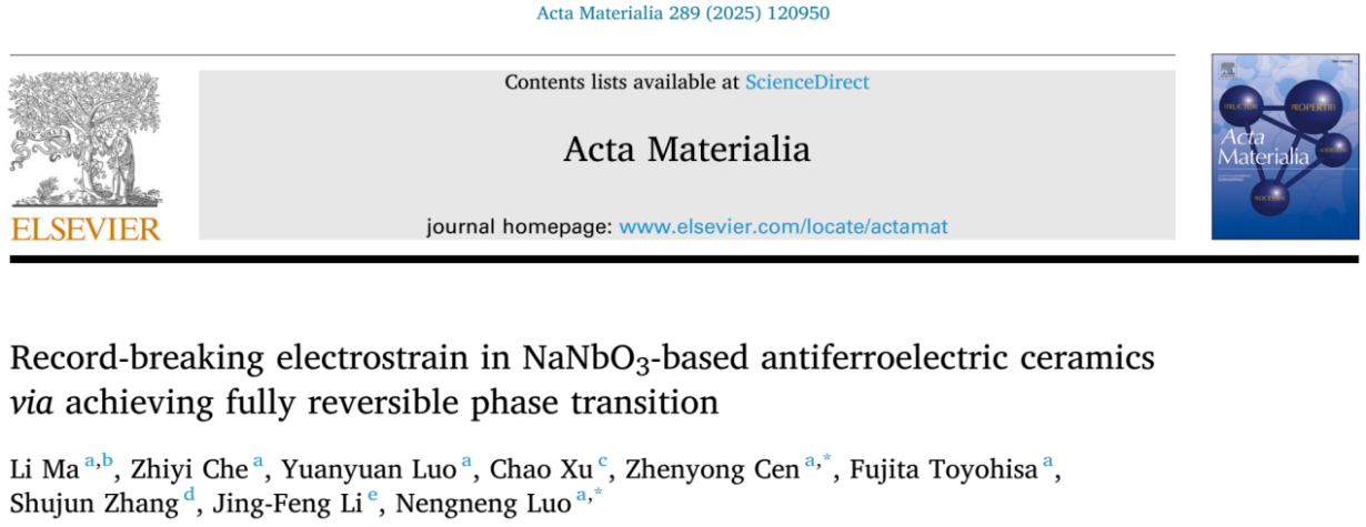 近日,我院罗能能教授团队在无铅反铁电陶瓷电致应变领域取得重要进展,相关研究成果以“Record-breaking electrostrain in NaNbO3-based antiferroelectric ceramics via achieving fully reversible phase transition”为题,发表在材料领域期刊Acta Materialia上。我院罗能能教授、岑侦勇副教授为共同通讯作者,罗能能教授指导的博士研究生马力为该论文的第一作者。