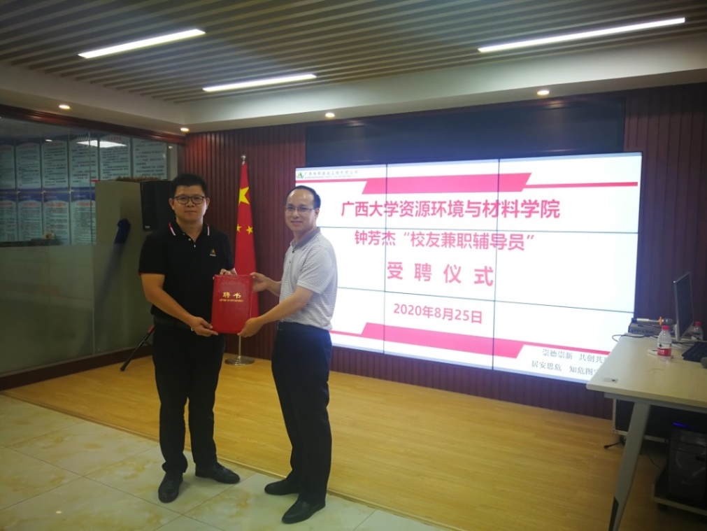 2020年8月25日,资源环境与材料学院党委沈大强书记带队,吴达慧副书记、吴仲雄教授、谭海文副教授、王纪坤老师前往南宁市武鸣区,到校友企业—广西铭明建设工程有限公司考察调研,同时为我院“校友兼职辅导员”该公司董事长钟芳杰颁发聘书。
