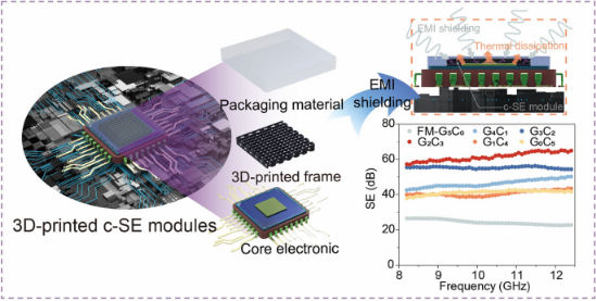 5G乃至6G 等无线通讯技术的发展极大促进了国防科技的进步与日常生活的便利。然而,无线电磁波在传播过程所引起的电磁辐射污染问题,已是现阶段通讯系统维护与人体健康保障面临的重大难题,发展电磁屏蔽材料与器件是解决电磁辐射污染的关键途径。面向这一重要需求,程芳超老师团队利用高负载量(~80%)的碳基油墨,结合3D打印增材制造技术,打印成型了轻量化(0.076 g cm-3)、高效电磁屏蔽效能(61.4 dB,电磁波透过率<0. 0001%)的碳基电磁屏蔽结构。同时,针对电子元器件的电磁防护要求,论文一体化设计、打印了兼具电磁屏蔽与辅助散热的功能模组,并论证了其在特定电磁环境下的预期屏蔽要求。本研究不仅拓展了3D打印先进制造技术的潜在应用前景,还为下一代高性能碳基电磁屏蔽模组的设计与组装提供了创新思路。